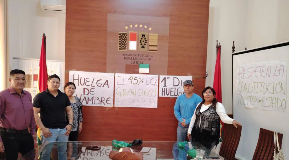 Cinco asambleístas de la región chaqueña también se declararon en huelga de hambre en defensa del 45% de las regalías y se oponen a la aprobación del proyecto de Ley de las dos provincias.Mientras sectores cívicos y sociales de Bermejo y Padcaya, de la provincia Arce, continúan movilizados en las afueras de la Asamblea Legislativa en la capital tarijeña.